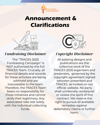 All existing designs and publications are the collective work of the TRACES 2025 organisers and presenters, governed by the copyright agreement signed between presenters and TRACES, as hosted on our official website. No party shall unilaterally reinterpret or violate the spirit of this contract. We reserve the right to pursue all available remedies against defamatory claims or further harm.